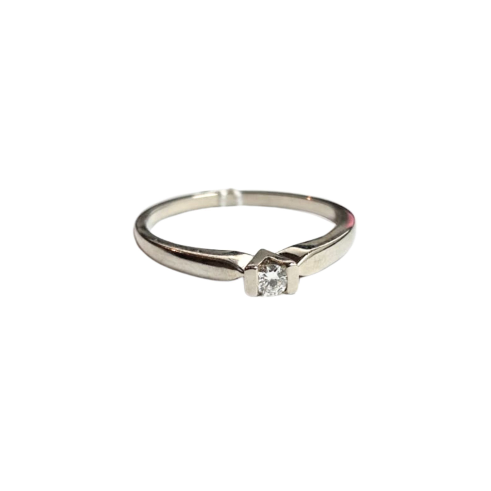 Pierścionek w minimalistycznej formie wykonany z białego złota zdobiony diamentem.